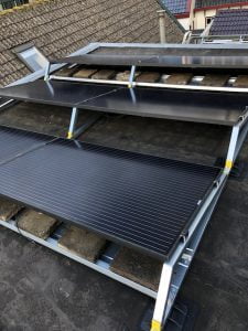 Totaal 60 zonnepanelen van AUO BenQ 300 Wp all black en Denim 300 Wp all black. Allen uitgevoerd met power optimizers en omvormer van SolarEdge in een parallelle aansluiting. Onderconstructie van de schuine daken is van Clickfit met haken en plat dak uitgevoerd met Sunbeam.